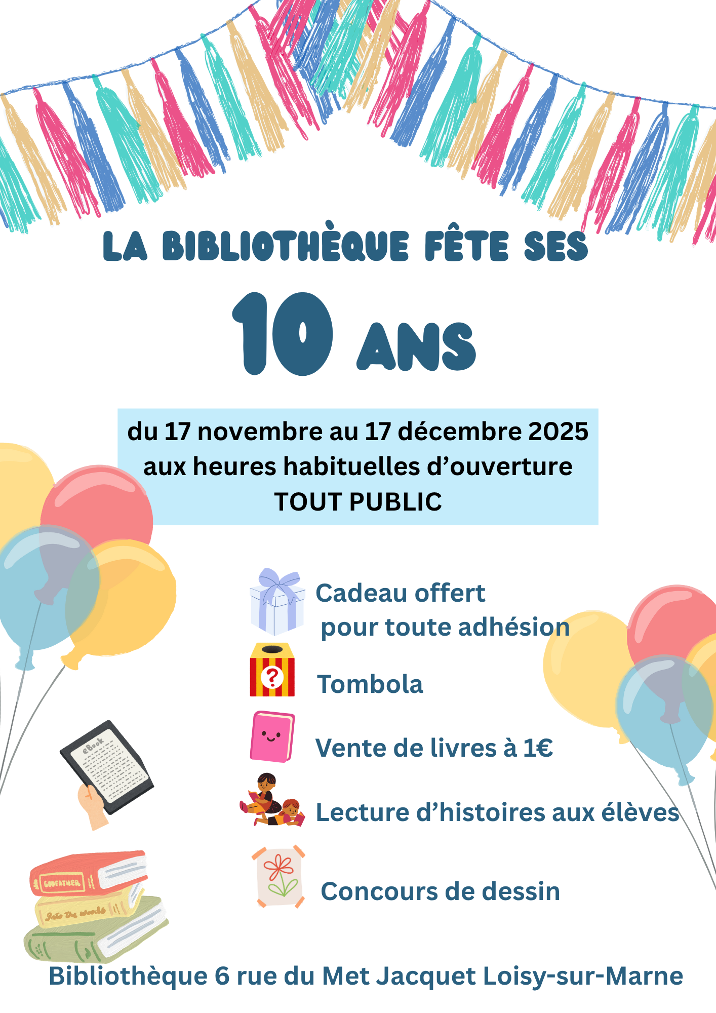 Du 17 novembre au 17 décembre aux horaires habituels d'ouverture, venez fêter les 10 ans de la bibliothèque de Loisy. Au programme : tombola, ventes de livres à 1€, lectures d'histoires et concours de dessin. Et, cerise sur le gâteau : un cadeau sera offert pour toute adhésion !